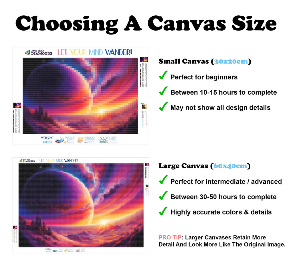 Large canvases show tiny details and all lettering, but may take up to 50+ hours to complete.