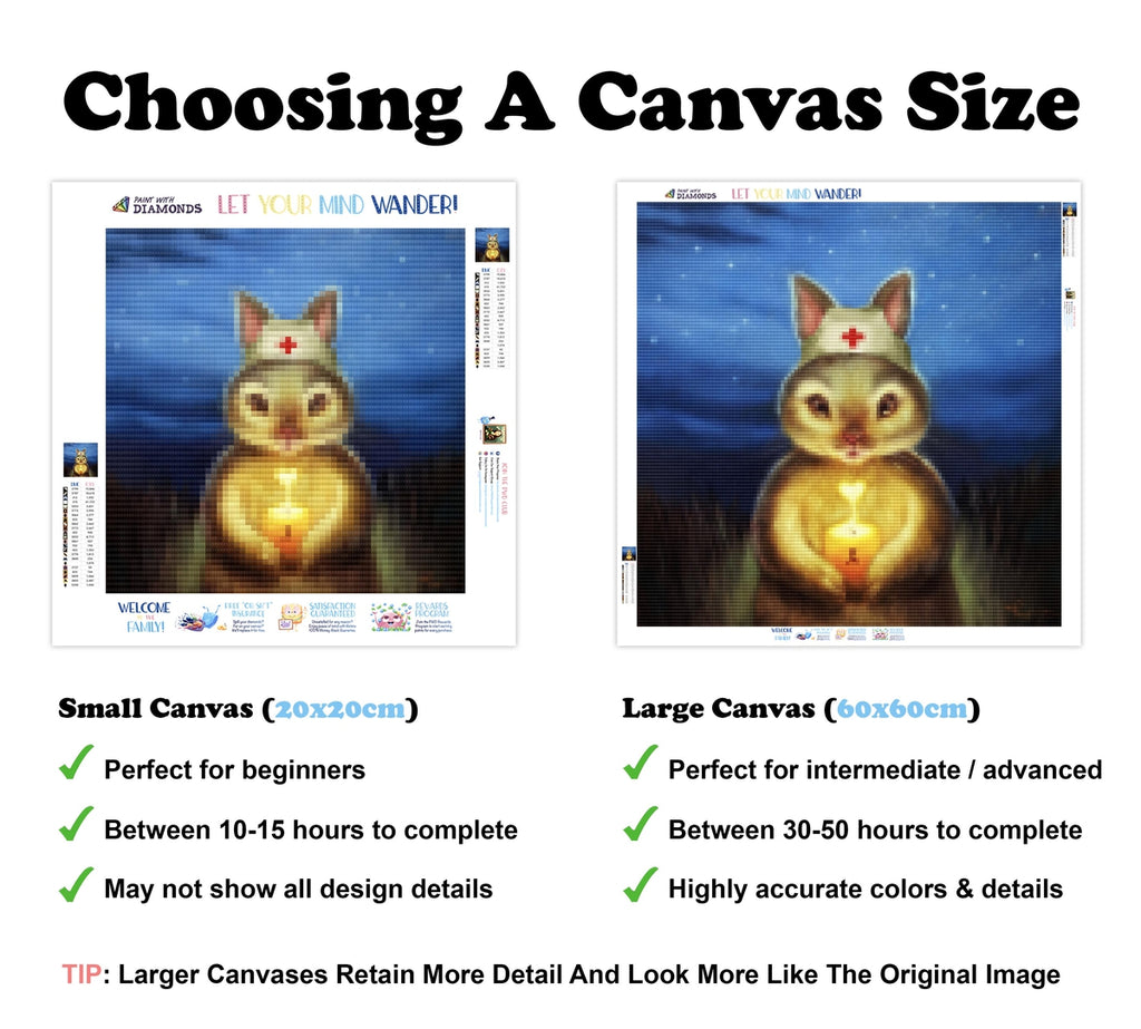 Large canvases show tiny details and all lettering, but may take up to 50+ hours to complete.