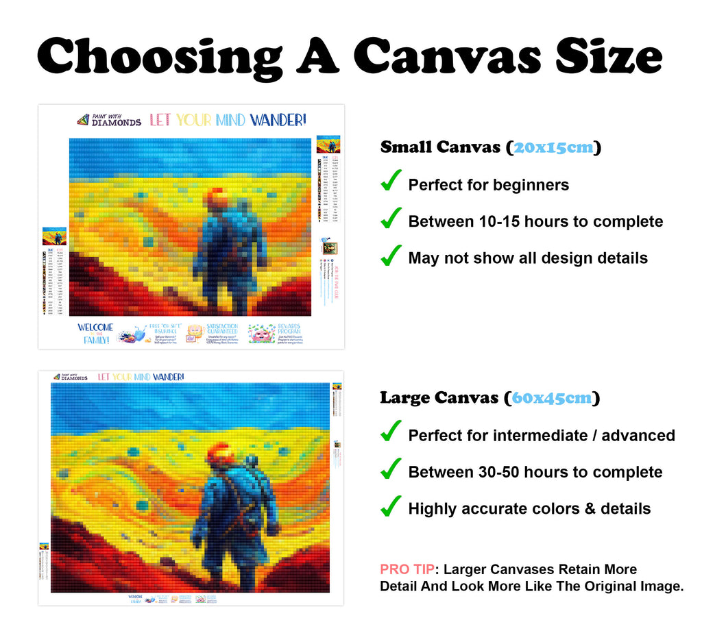 Large canvases show tiny details and all lettering, but may take up to 50+ hours to complete.