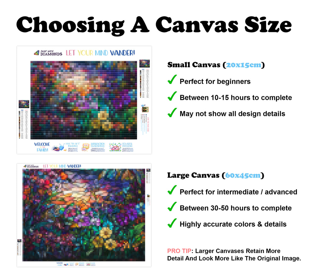 Large canvases show tiny details and all lettering, but may take up to 50+ hours to complete.