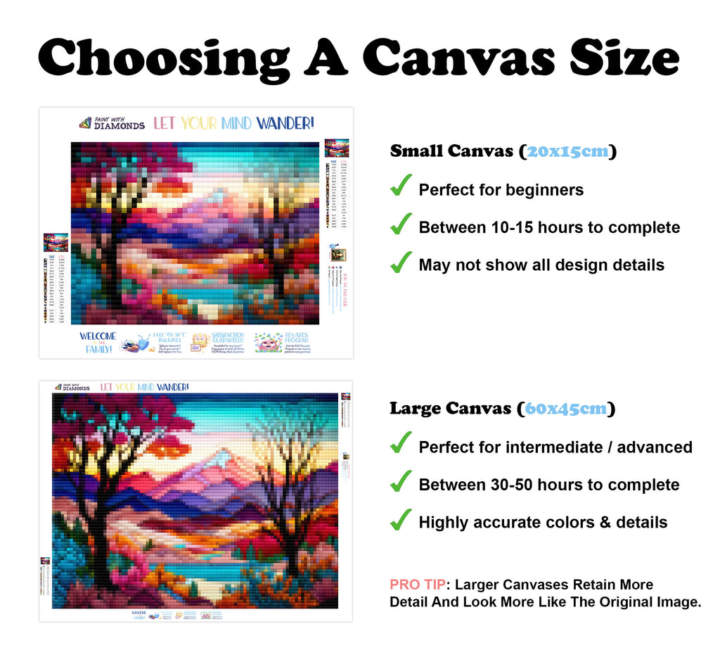 Large canvases show tiny details and all lettering, but may take up to 50+ hours to complete.