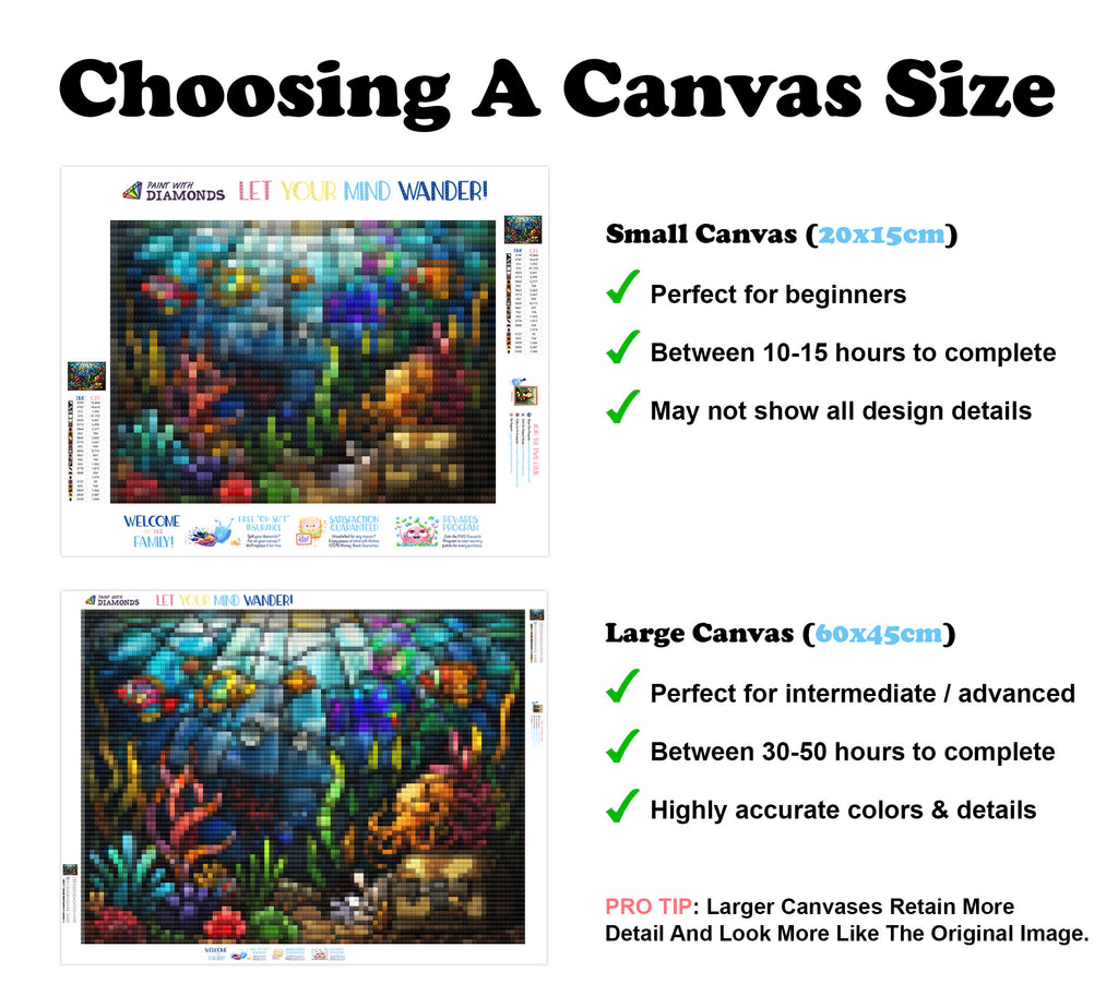Large canvases show tiny details and all lettering, but may take up to 50+ hours to complete.
