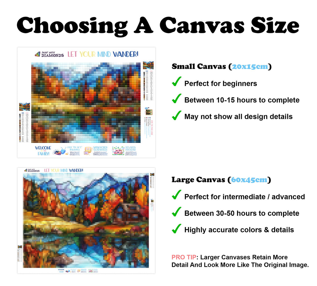 Large canvases show tiny details and all lettering, but may take up to 50+ hours to complete.