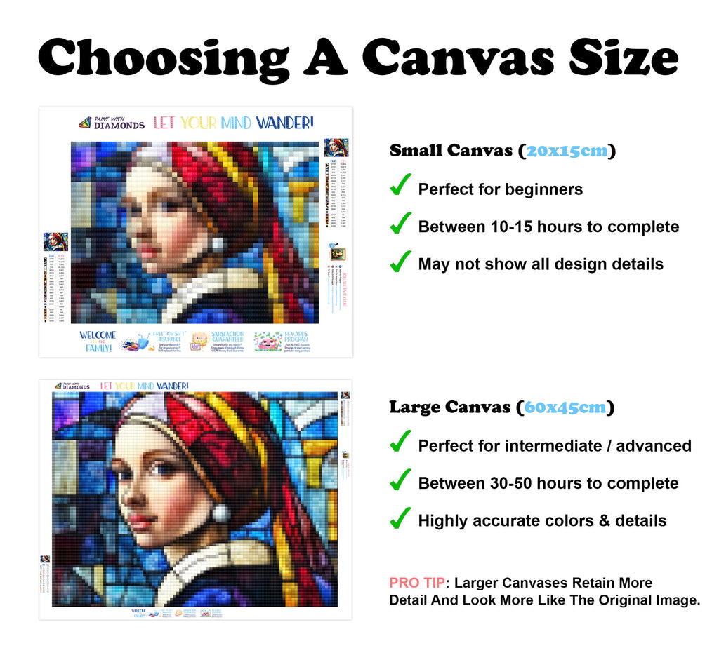 Large canvases show tiny details and all lettering, but may take up to 50+ hours to complete.