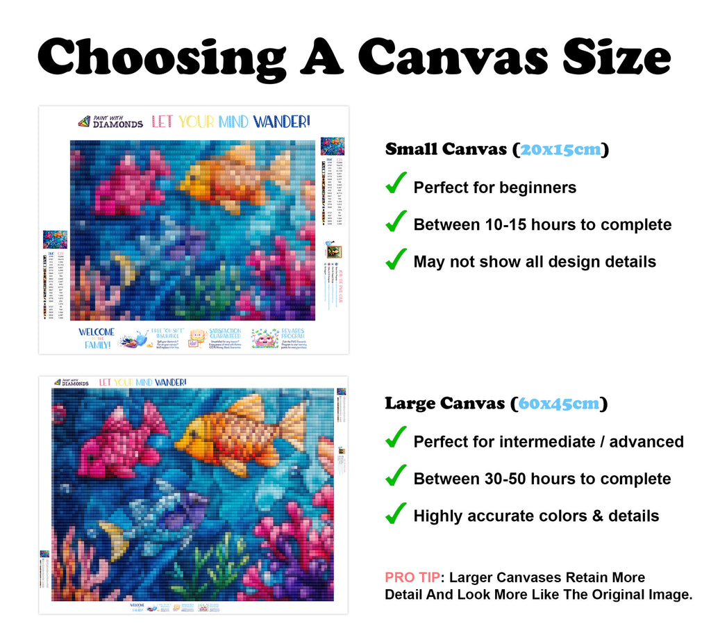 Large canvases show tiny details and all lettering, but may take up to 50+ hours to complete.