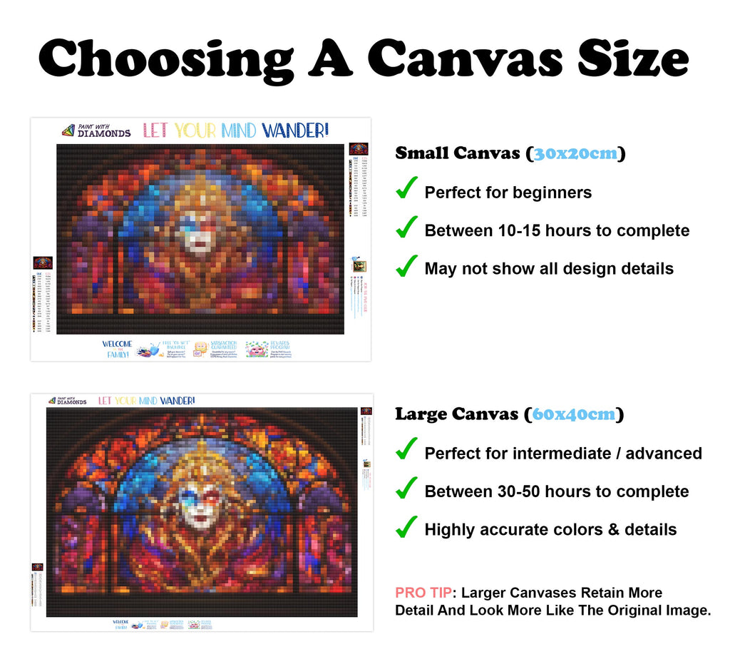 Large canvases show tiny details and all lettering, but may take up to 50+ hours to complete.