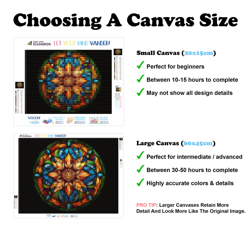 Large canvases show tiny details and all lettering, but may take up to 50+ hours to complete.