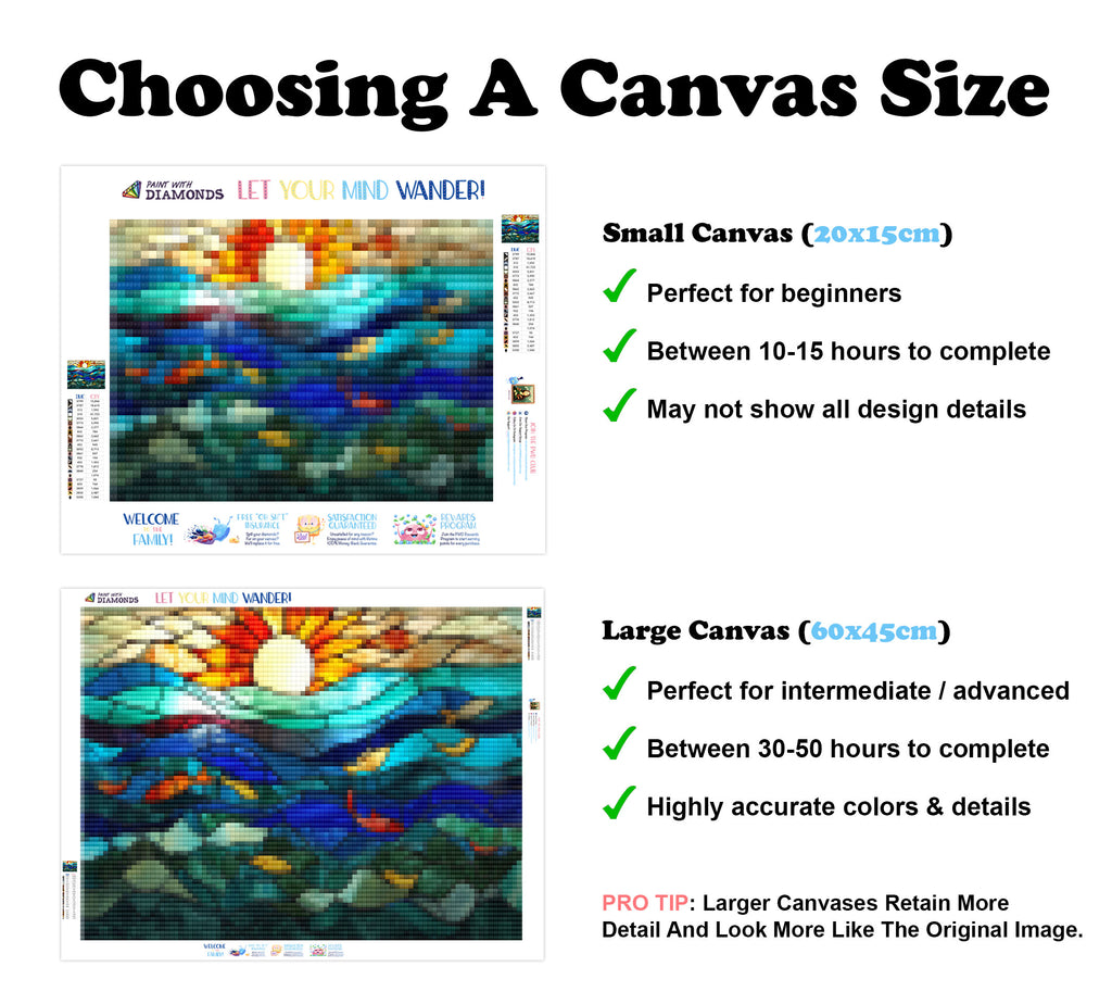 Large canvases show tiny details and all lettering, but may take up to 50+ hours to complete.