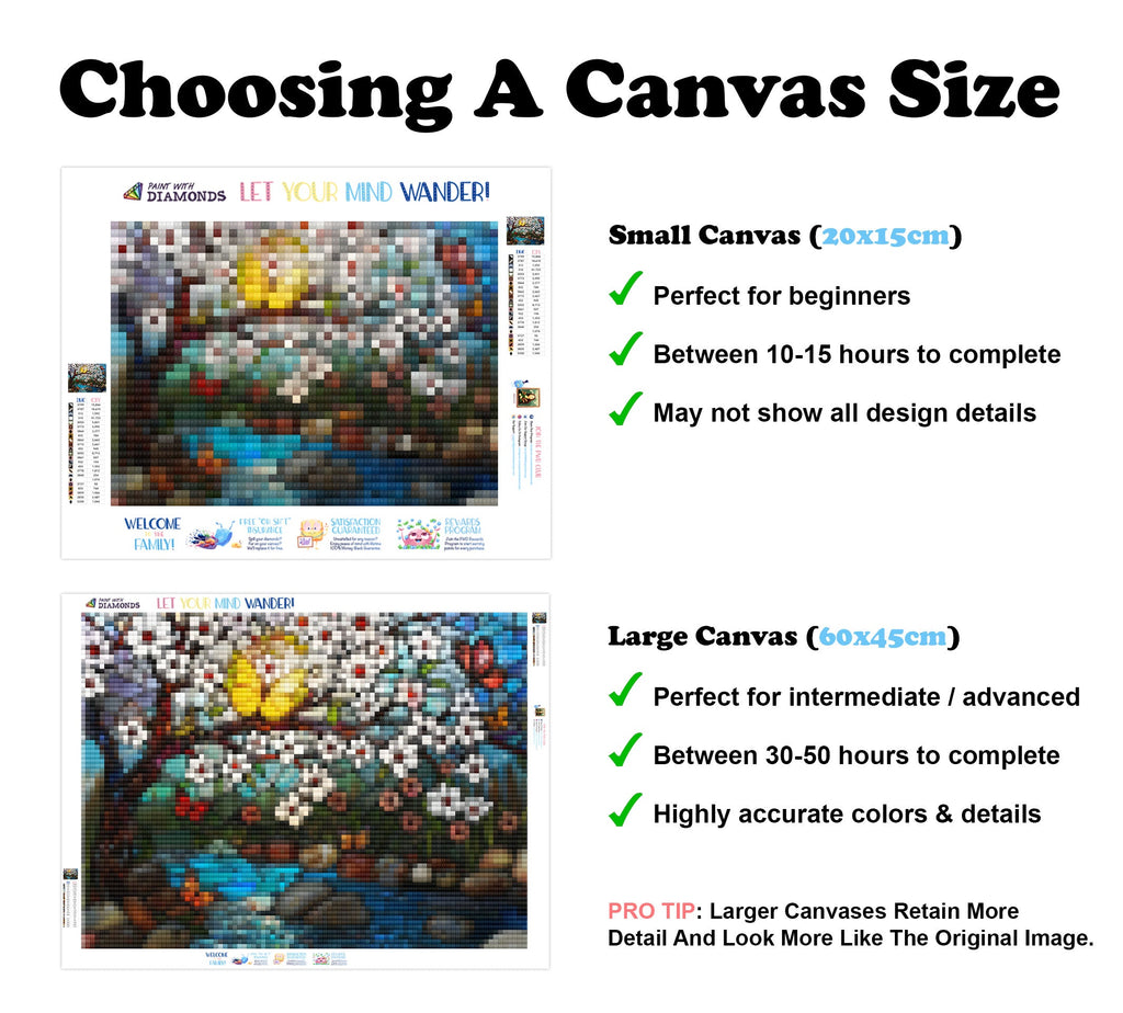 Large canvases show tiny details and all lettering, but may take up to 50+ hours to complete.