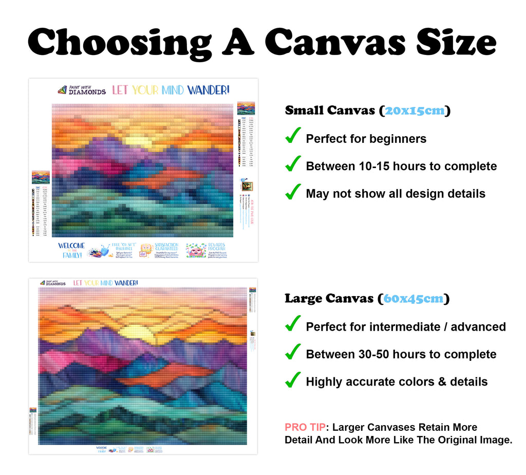 Large canvases show tiny details and all lettering, but may take up to 50+ hours to complete.