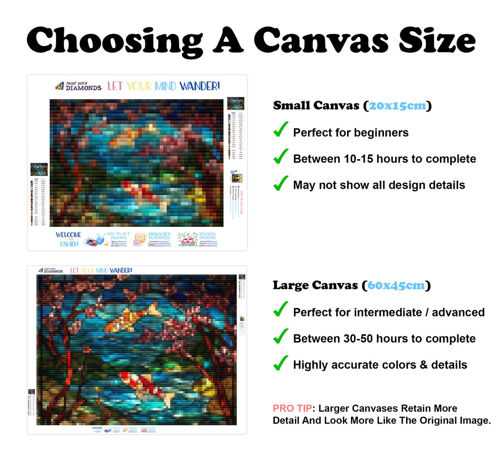 Large canvases show tiny details and all lettering, but may take up to 50+ hours to complete.