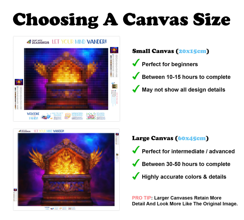 Large canvases show tiny details and all lettering, but may take up to 50+ hours to complete.