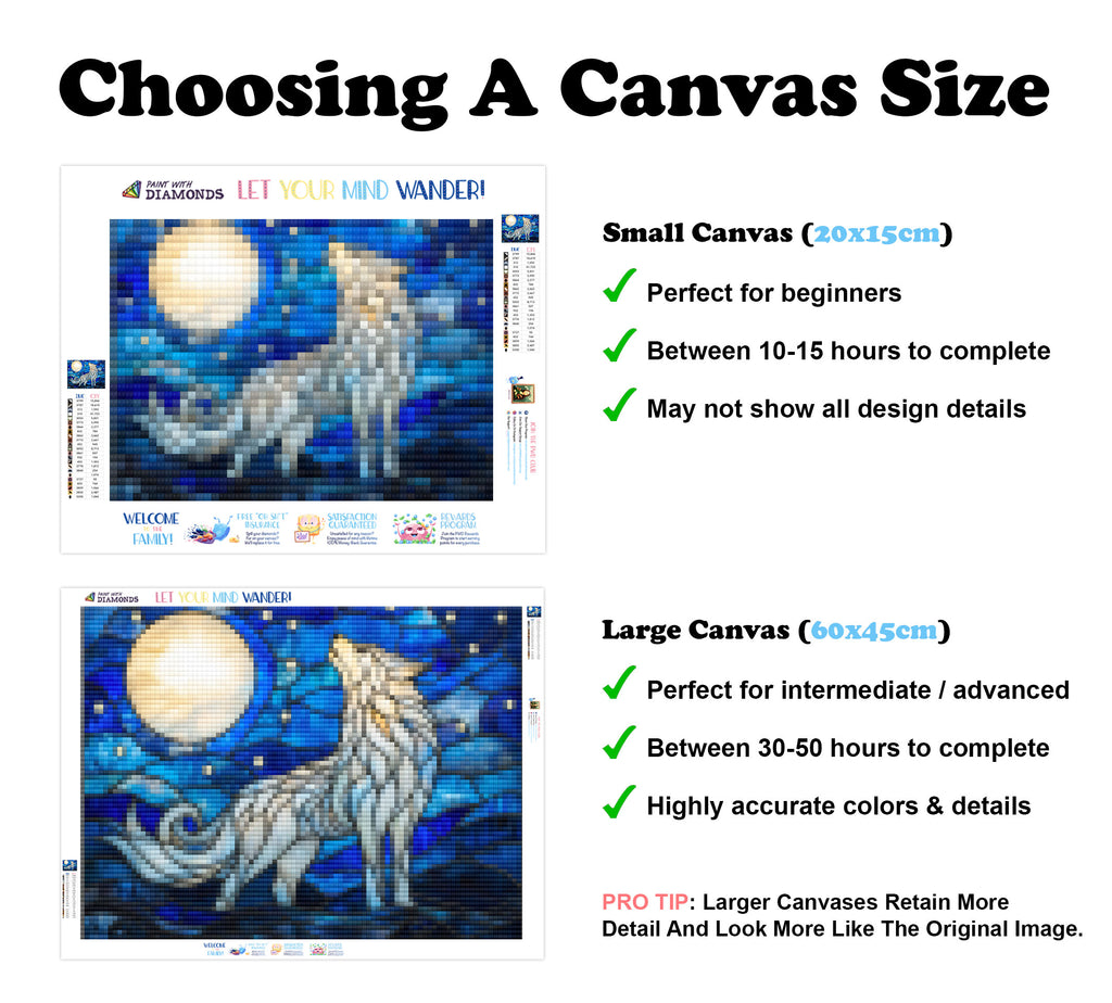 Large canvases show tiny details and all lettering, but may take up to 50+ hours to complete.