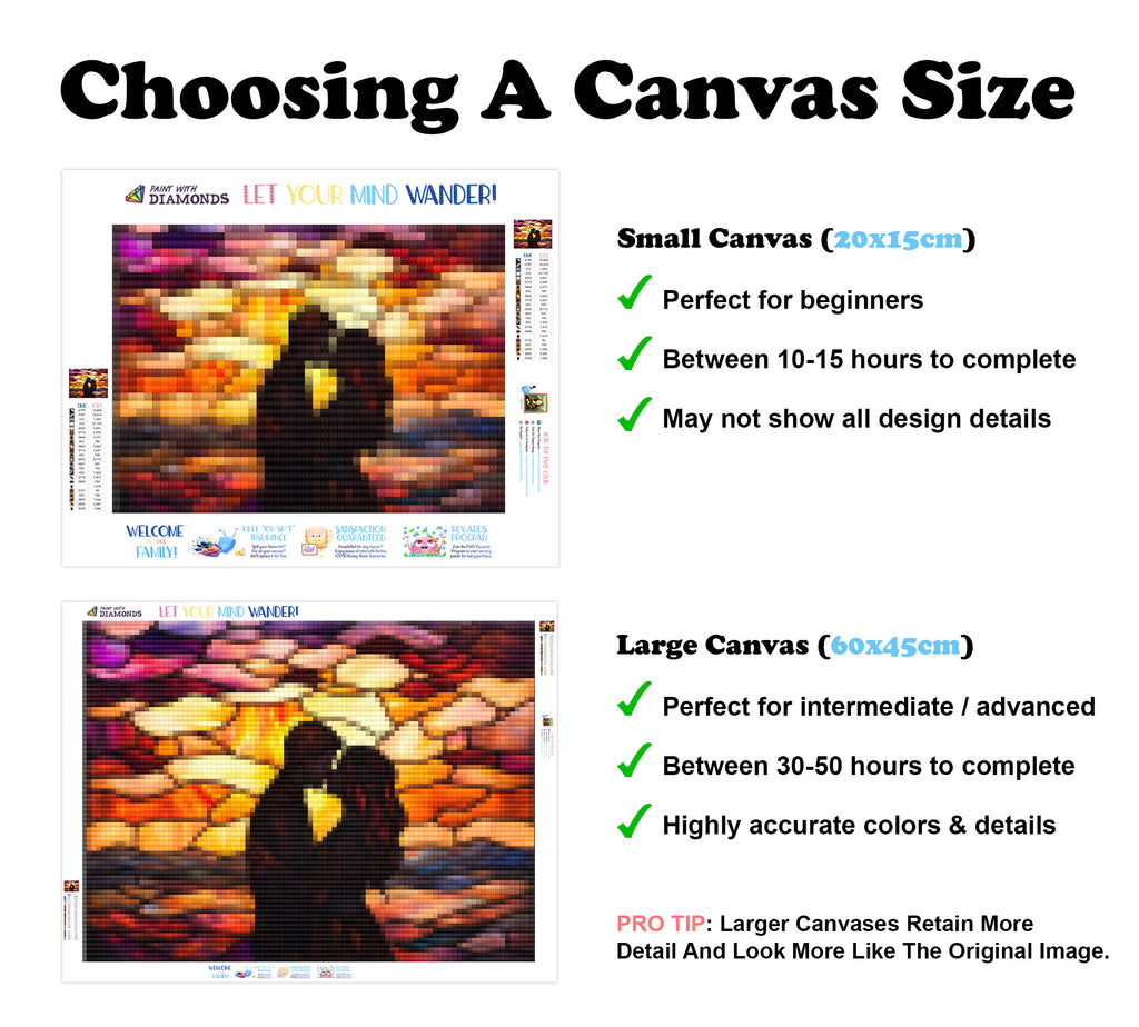 Large canvases show tiny details and all lettering, but may take up to 50+ hours to complete.