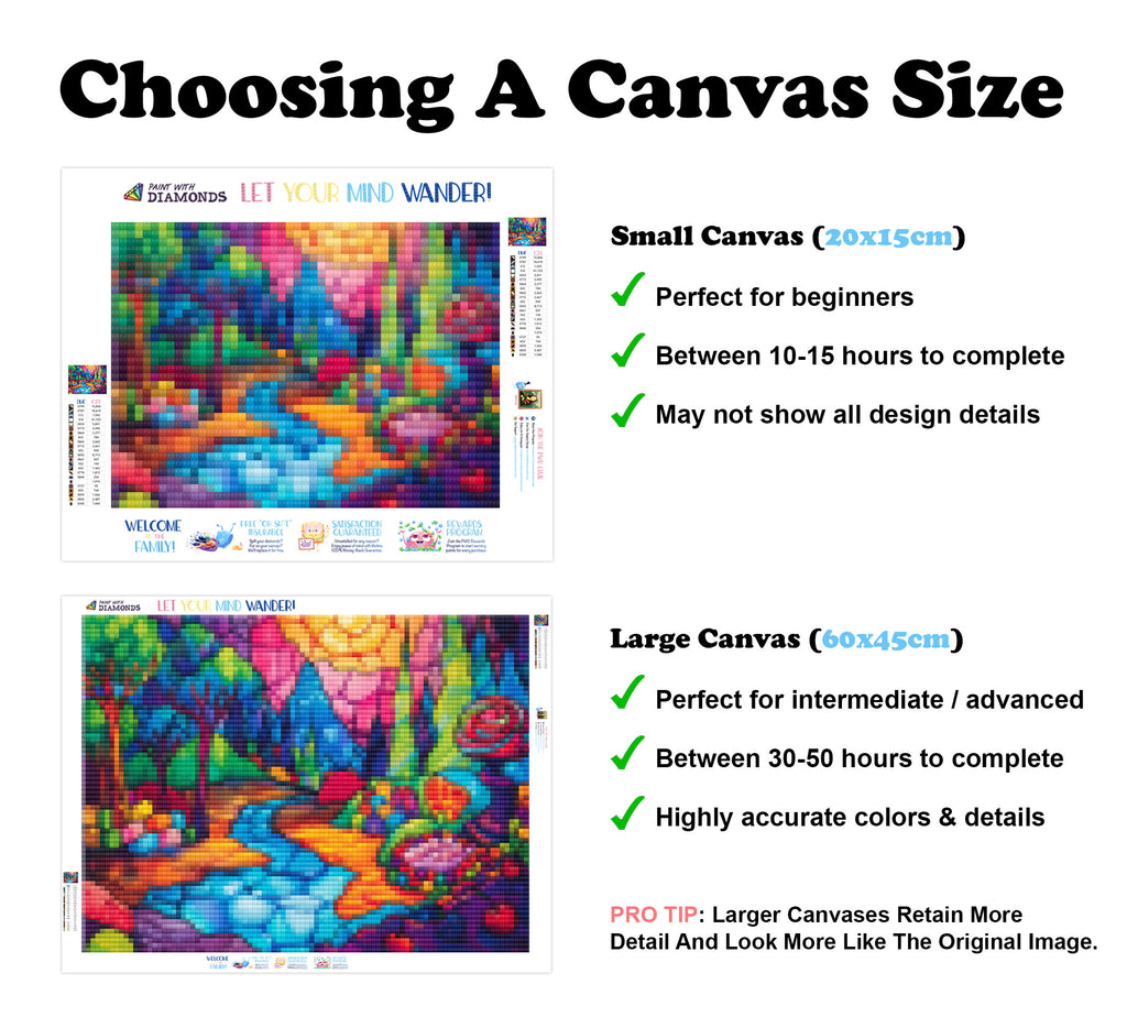 Large canvases show tiny details and all lettering, but may take up to 50+ hours to complete.