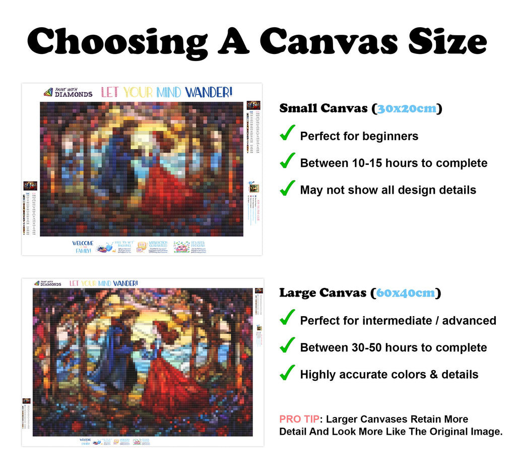 Large canvases show tiny details and all lettering, but may take up to 50+ hours to complete.