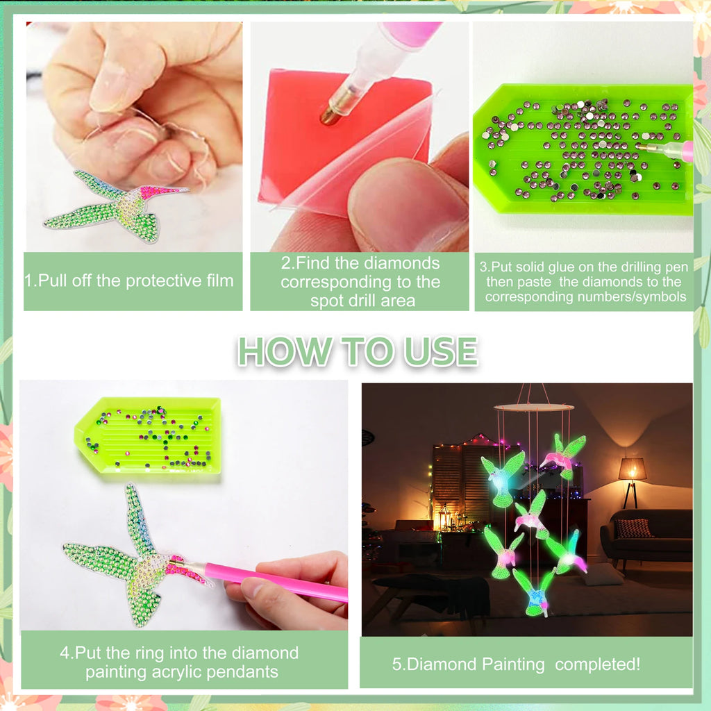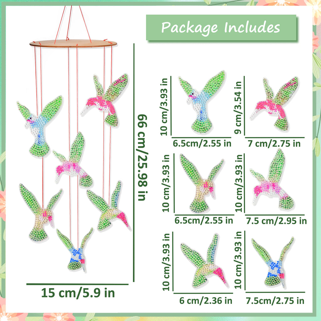 🦜 One-Sided Diamond Painting Hummingbirds: Each of the six charming pendants features a one-sided diamond painting design. Adorned with sparkling crystal rhinestones, they shimmer beautifully in the sunlight and glow in the dark, creating a captivating effect after sunset.