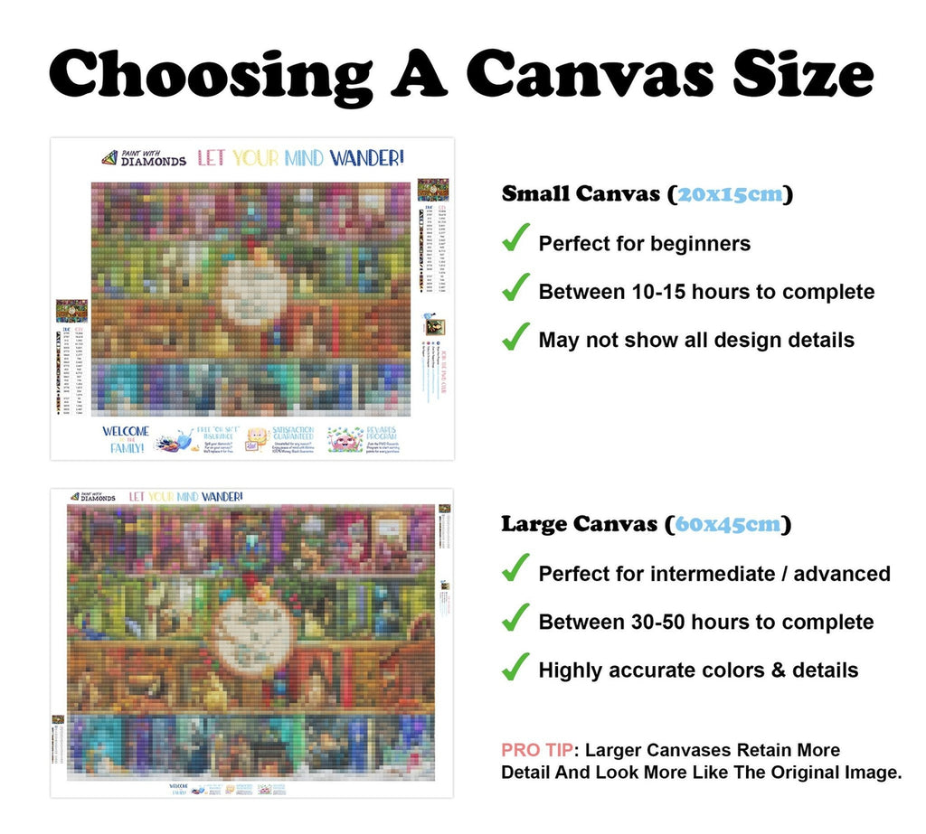 Large canvases show tiny details and all lettering, but may take up to 50+ hours to complete.