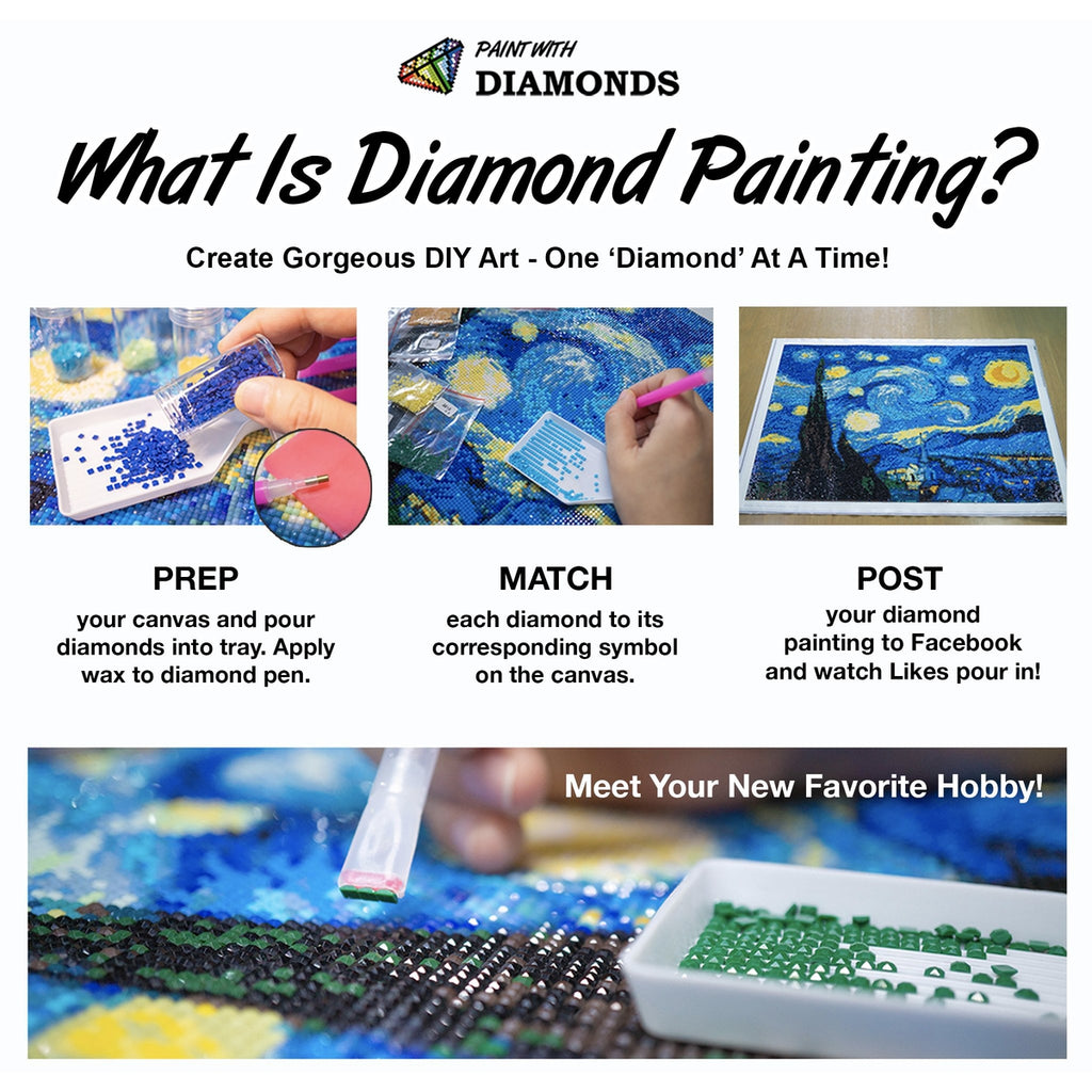 PREMIUM DIAMOND PAINTING KIT: Official Diamond Art kit includes 1x stay-flat adhesive canvas, 1x set of shimmering eco-friendly resin diamonds, and 1x premium toolkit. Diamonds cover the whole canvas.