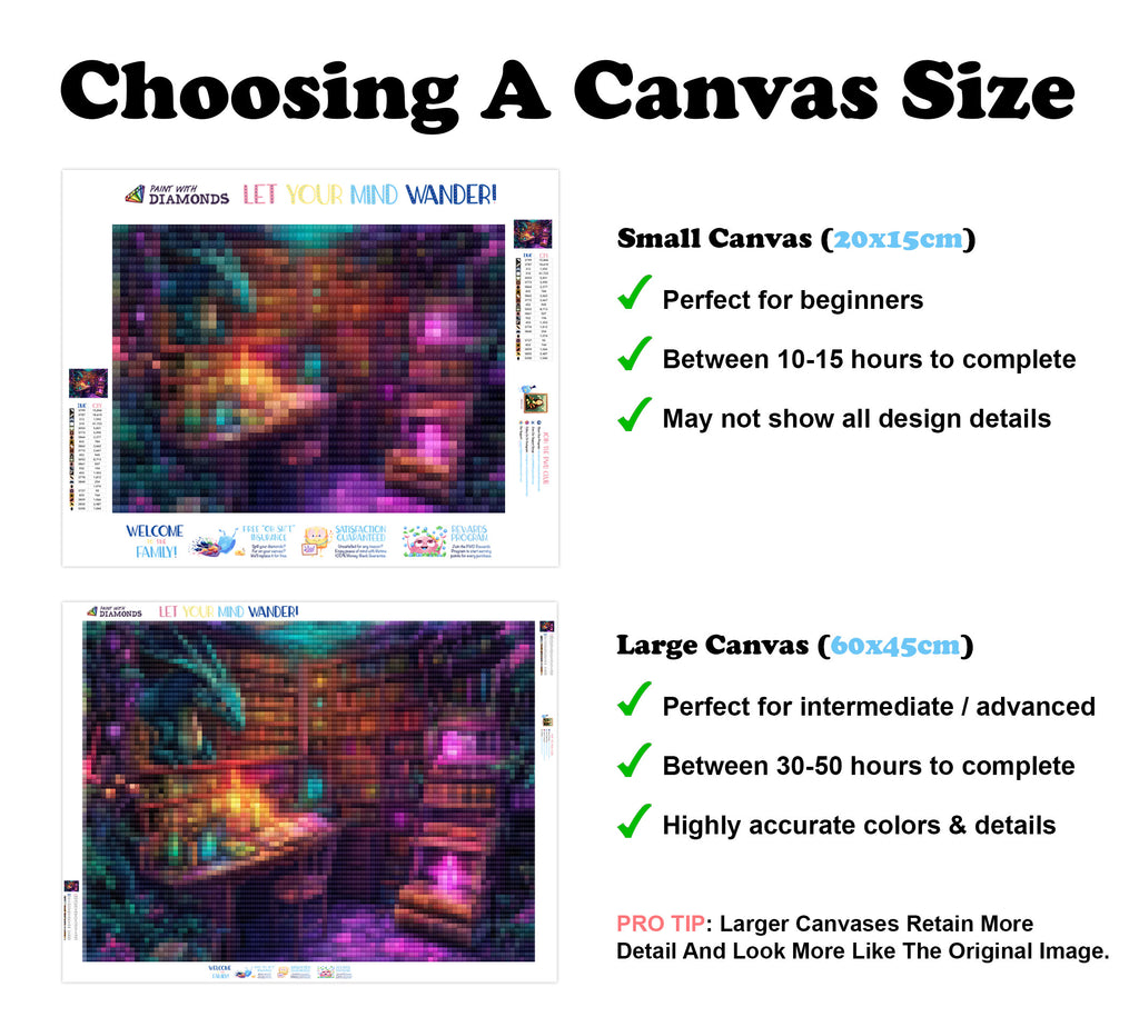 Large canvases show tiny details and all lettering, but may take up to 50+ hours to complete.