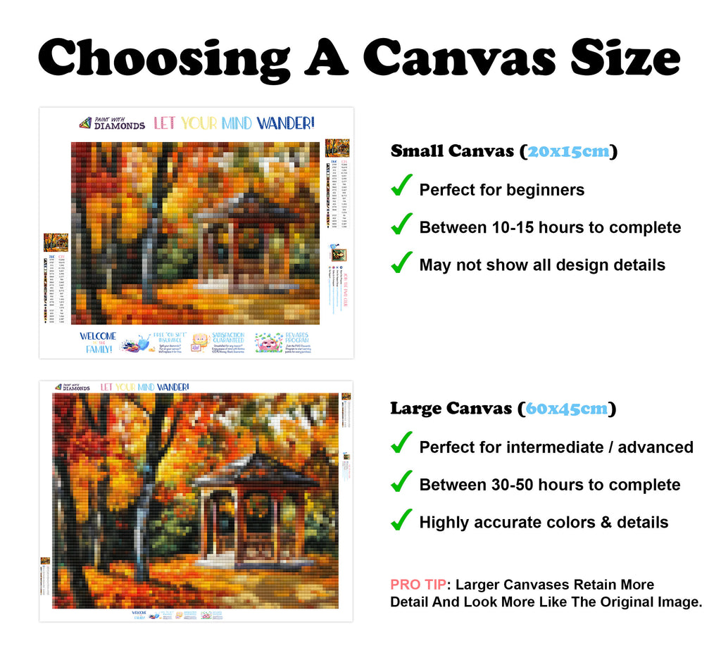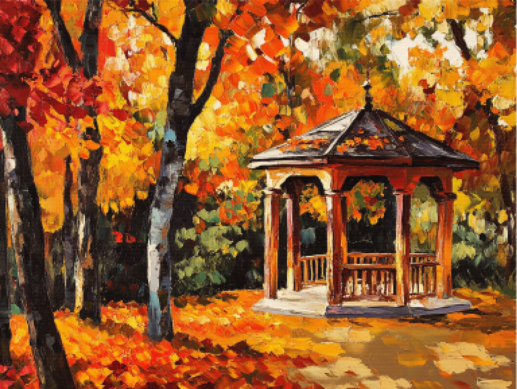 Escape into a world of vibrant colors and creative tranquility with the ‘Autumn Gazebo’ Diamond Painting Kit. This exclusive full-drill design by artist Luca Ardent is available only at Paint With Diamonds. Let your mind unwind as you piece together shimmering diamonds to create a beautiful masterpiece.