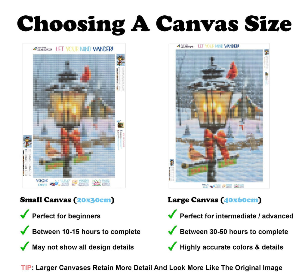Large canvases show tiny details and all lettering, but may take up to 50+ hours to complete.