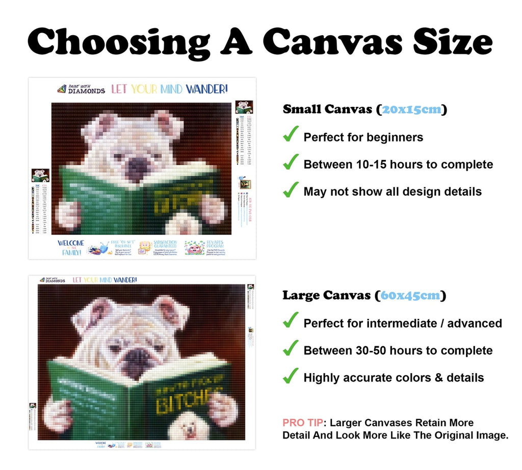 PREMIUM DIAMOND PAINTING KIT: Official Diamond Art kit includes 1x stay-flat adhesive canvas, 1x set of shimmering eco-friendly resin diamonds, and 1x premium toolkit. Diamonds cover the whole canvas.