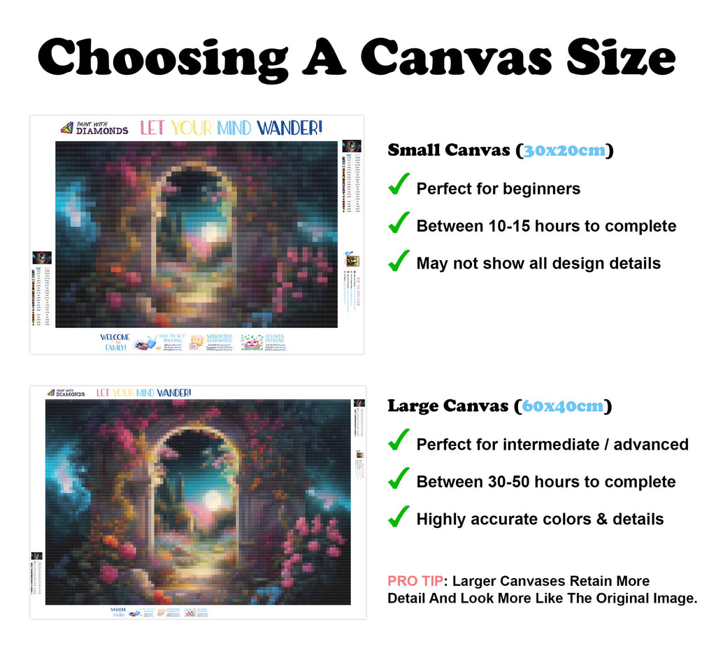Large canvases show tiny details and all lettering, but may take up to 50+ hours to complete.