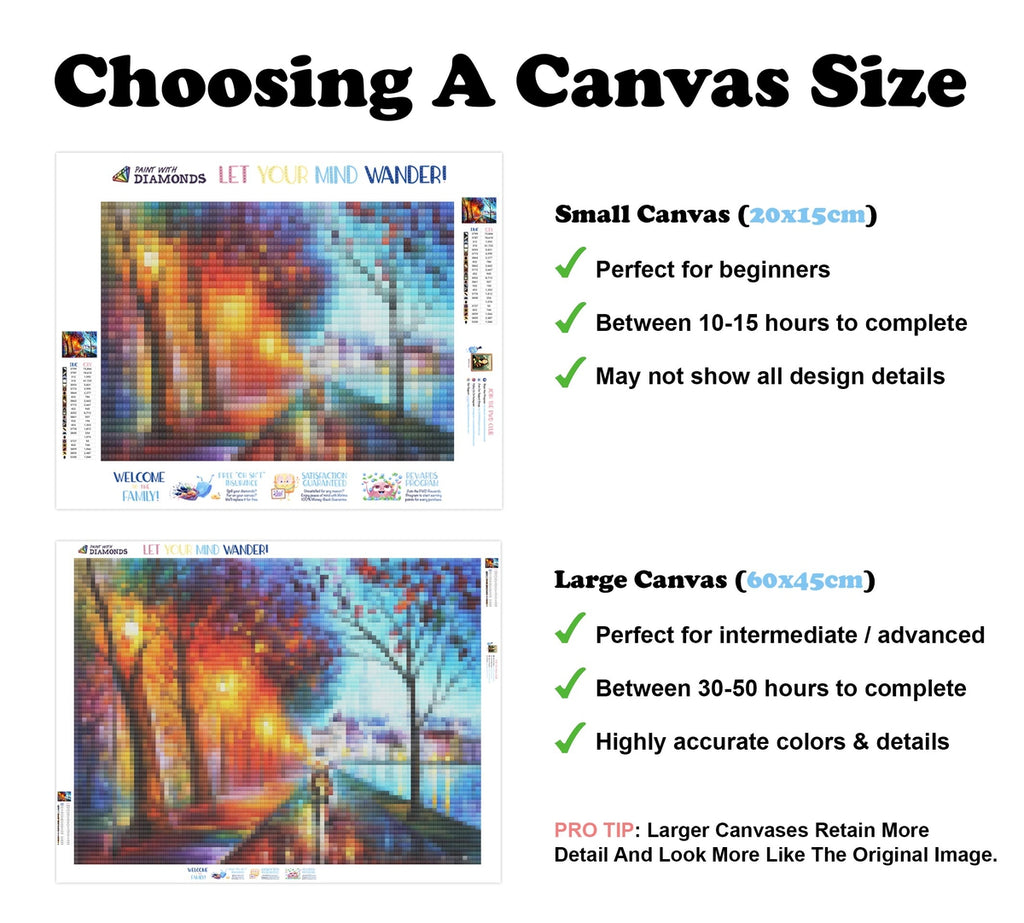 Large canvases show tiny details and all lettering, but may take up to 50+ hours to complete.