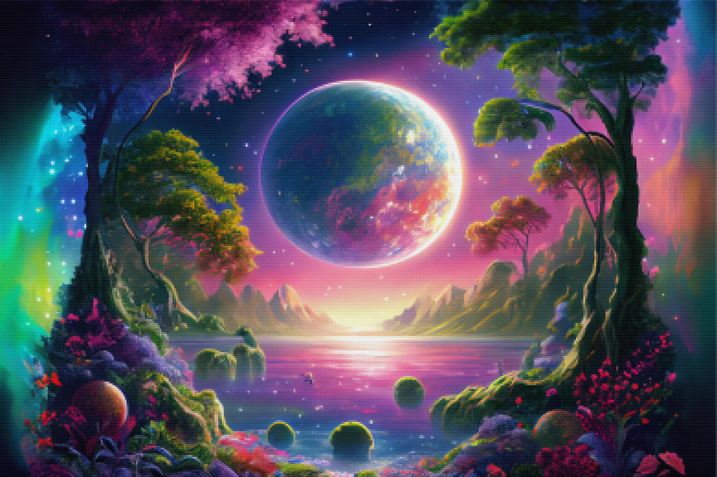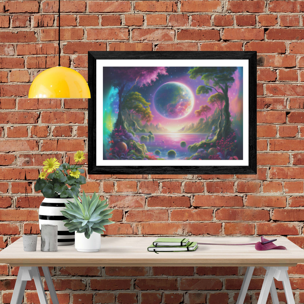 Escape into a world of vibrant colors and creative tranquility with the ‘Cosmic Oasis’ Diamond Painting Kit. This exclusive full-drill design by artist Caleb Smith is available only at Paint With Diamonds. Let your mind unwind as you piece together shimmering diamonds to create a beautiful masterpiece.