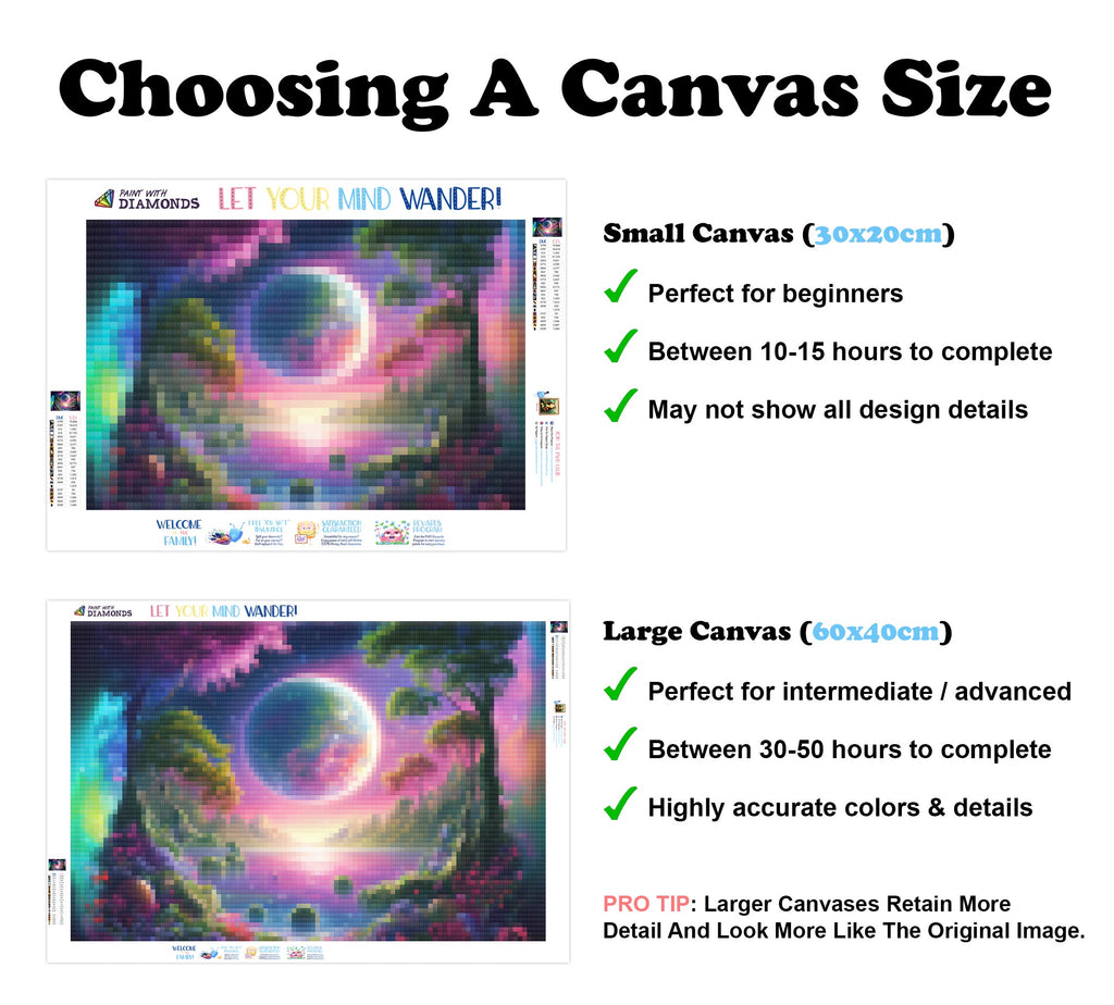 Large canvases show tiny details and all lettering, but may take up to 50+ hours to complete.