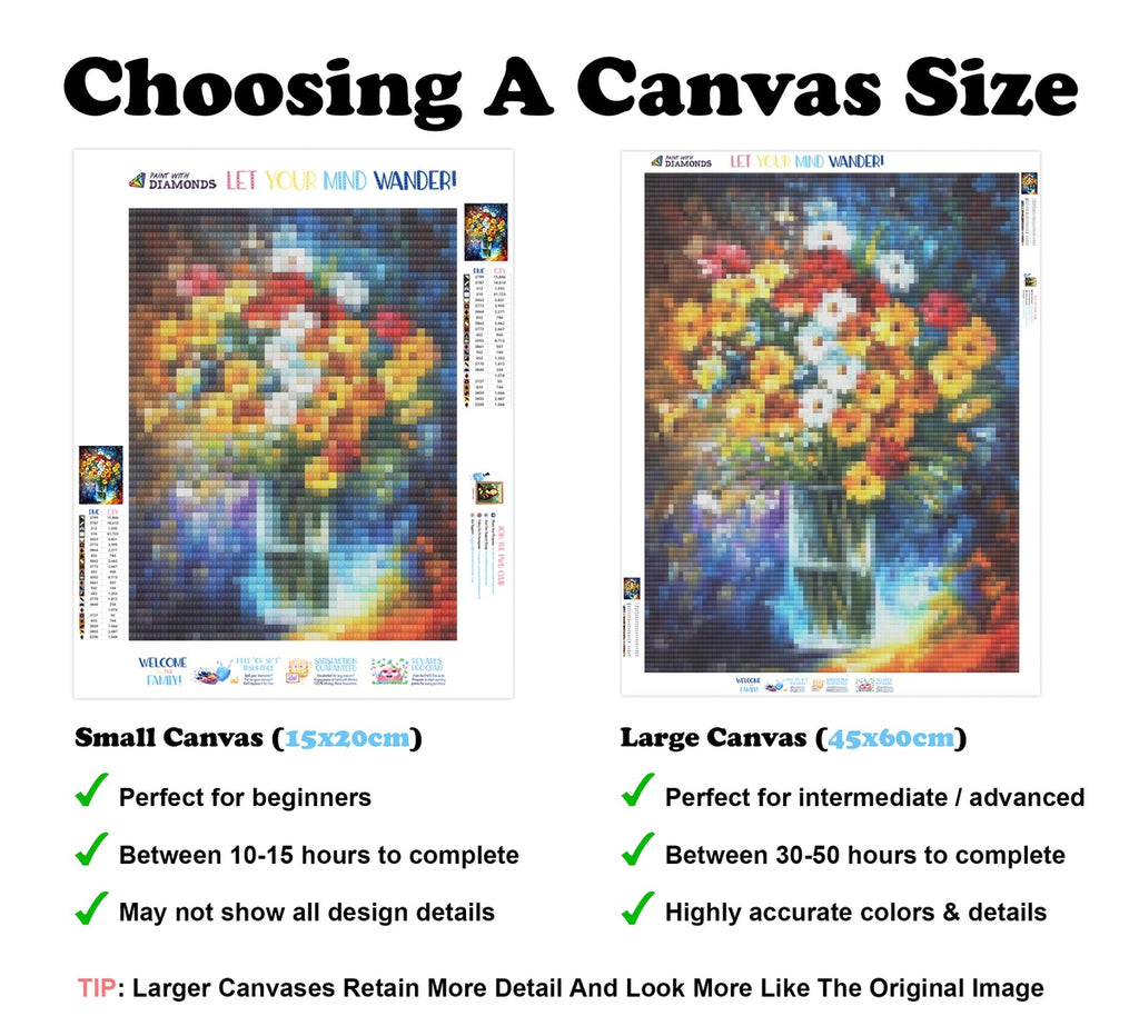 Large canvases show tiny details and all lettering, but may take up to 50+ hours to complete.
