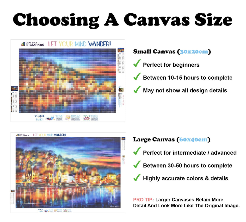 Large canvases show tiny details and all lettering, but may take up to 50+ hours to complete.