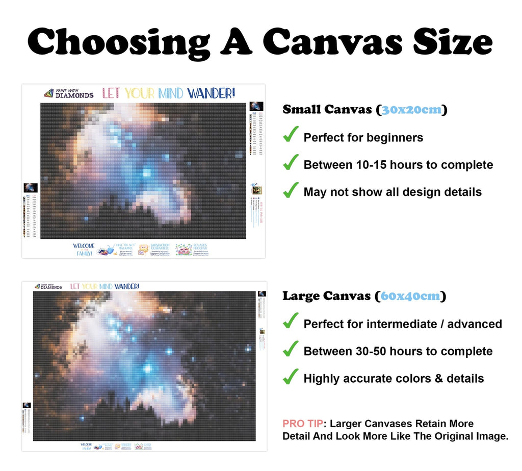 PREMIUM DIAMOND PAINTING KIT: Official Diamond Art kit includes 1x stay-flat adhesive canvas, 1x set of shimmering eco-friendly resin diamonds, and 1x premium toolkit. Diamonds cover the whole canvas.