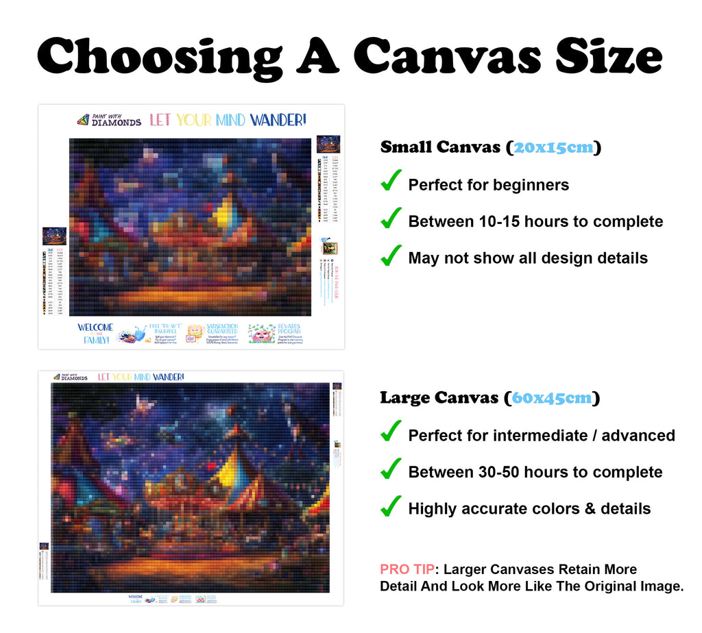 Large canvases show tiny details and all lettering, but may take up to 50+ hours to complete.