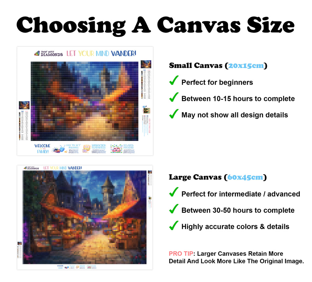 Large canvases show tiny details and all lettering, but may take up to 50+ hours to complete.