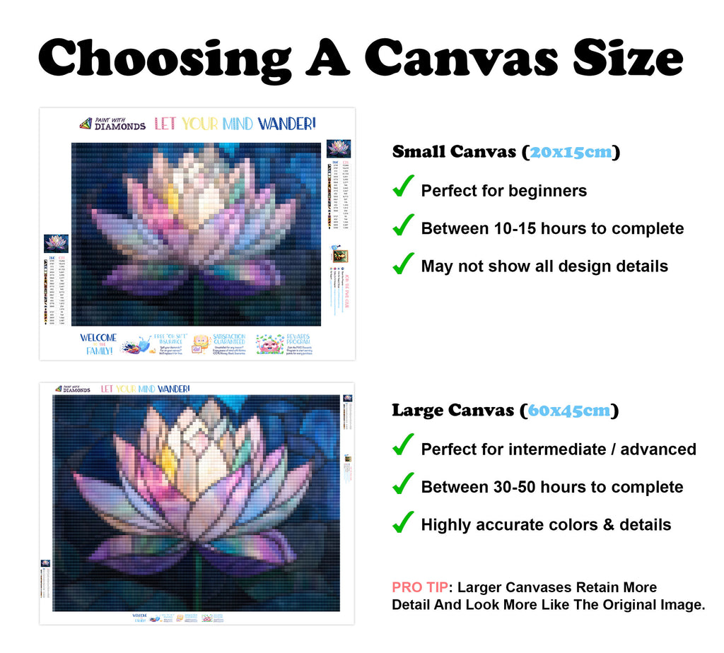 Large canvases show tiny details and all lettering, but may take up to 50+ hours to complete.