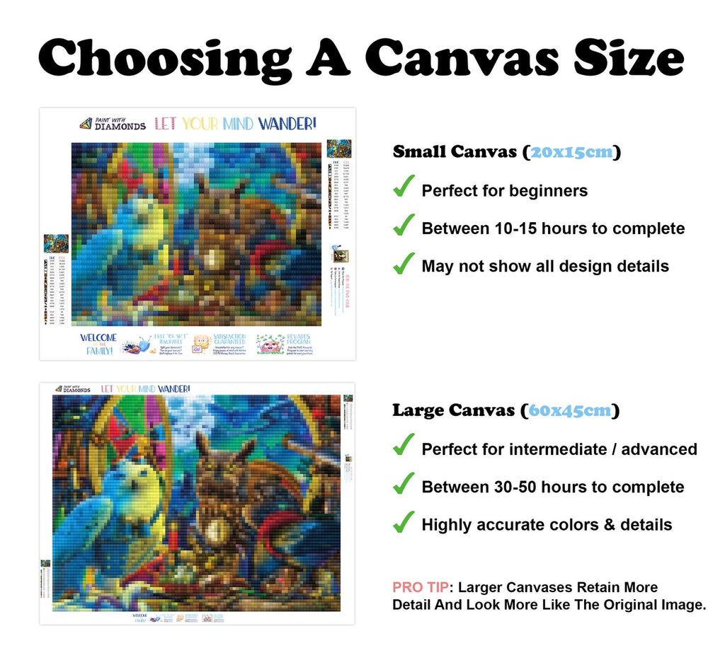 Large canvases show tiny details and all lettering, but may take up to 50+ hours to complete.