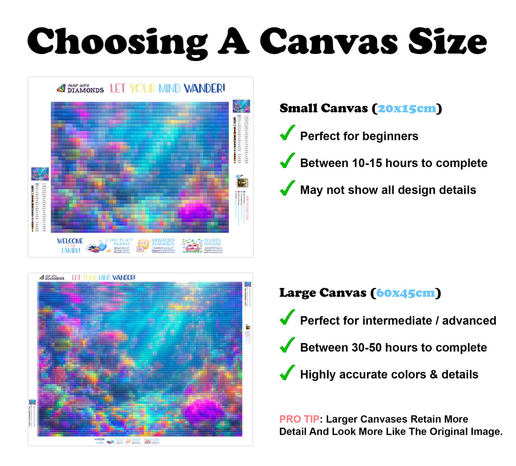 Large canvases show tiny details and all lettering, but may take up to 50+ hours to complete.
