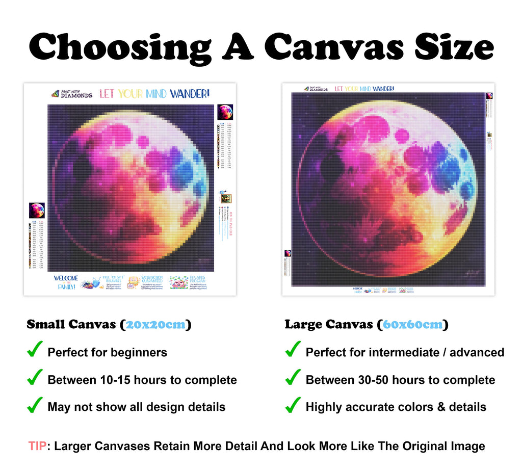 Large canvases show tiny details and all lettering, but may take up to 50+ hours to complete.