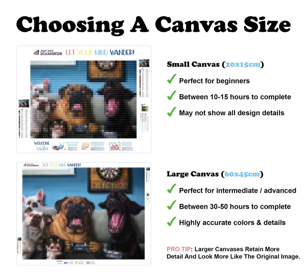 Large canvases show tiny details and all lettering, but may take up to 50+ hours to complete.