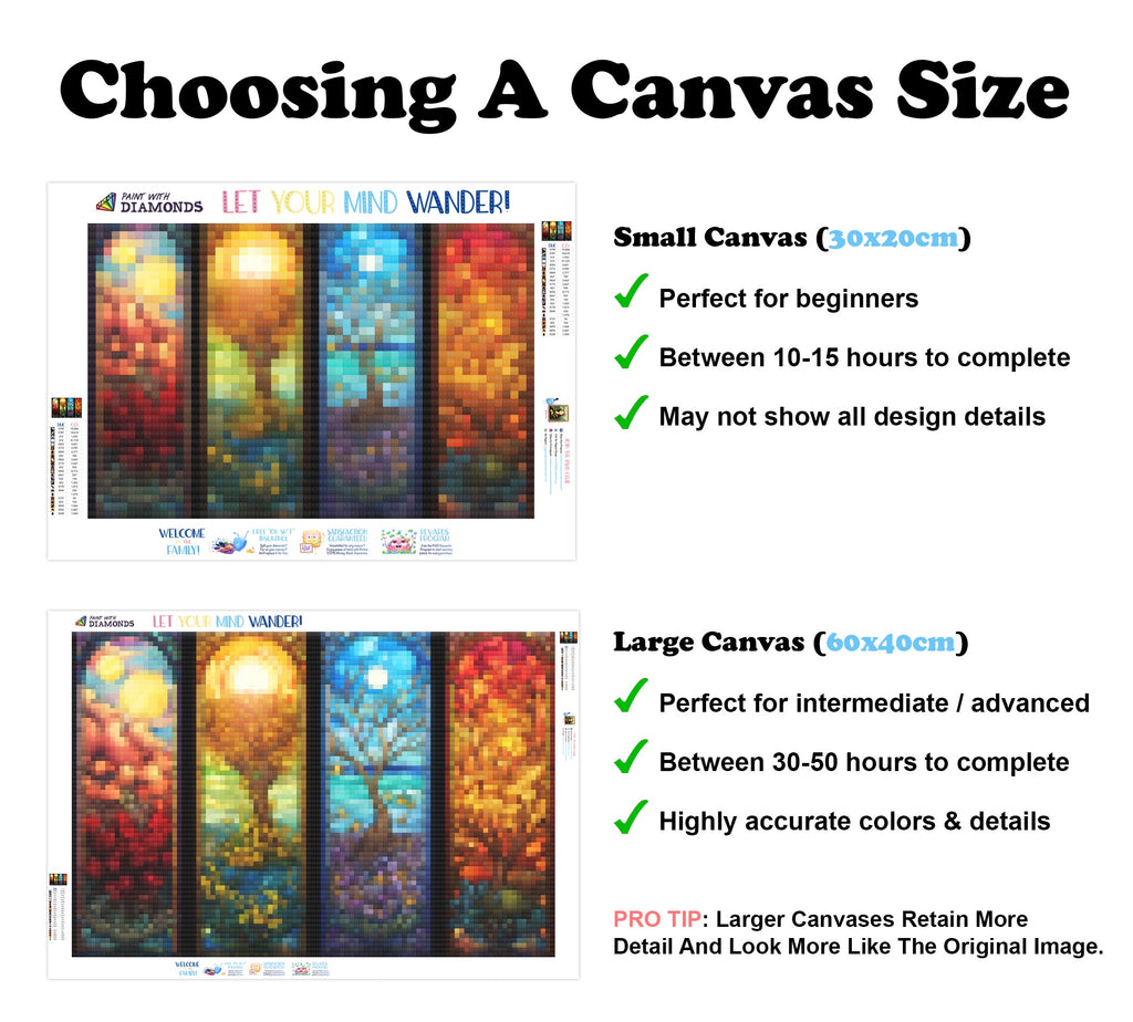 Large canvases show tiny details and all lettering, but may take up to 50+ hours to complete.