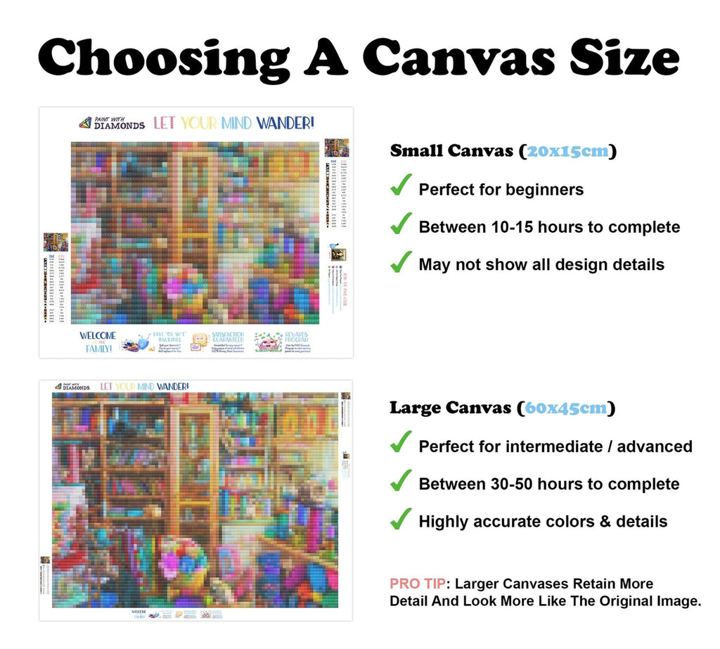 Large canvases show tiny details and all lettering, but may take up to 50+ hours to complete.