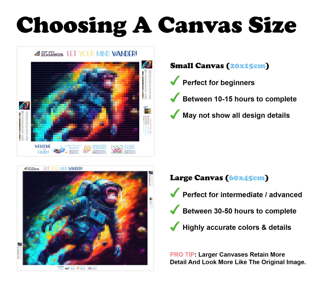 Large canvases show tiny details and all lettering, but may take up to 50+ hours to complete.