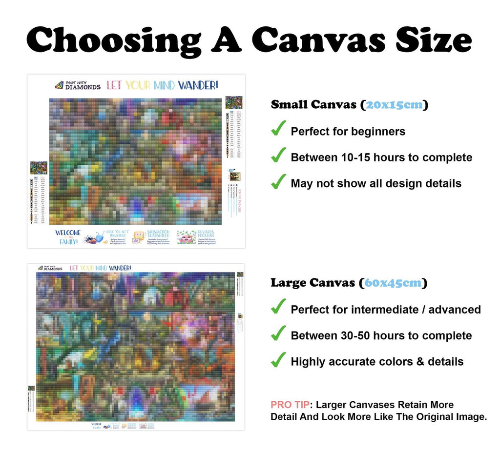 Large canvases show tiny details and all lettering, but may take up to 50+ hours to complete.