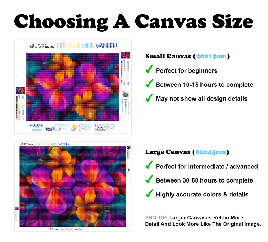 Large canvases show tiny details and all lettering, but may take up to 50+ hours to complete.