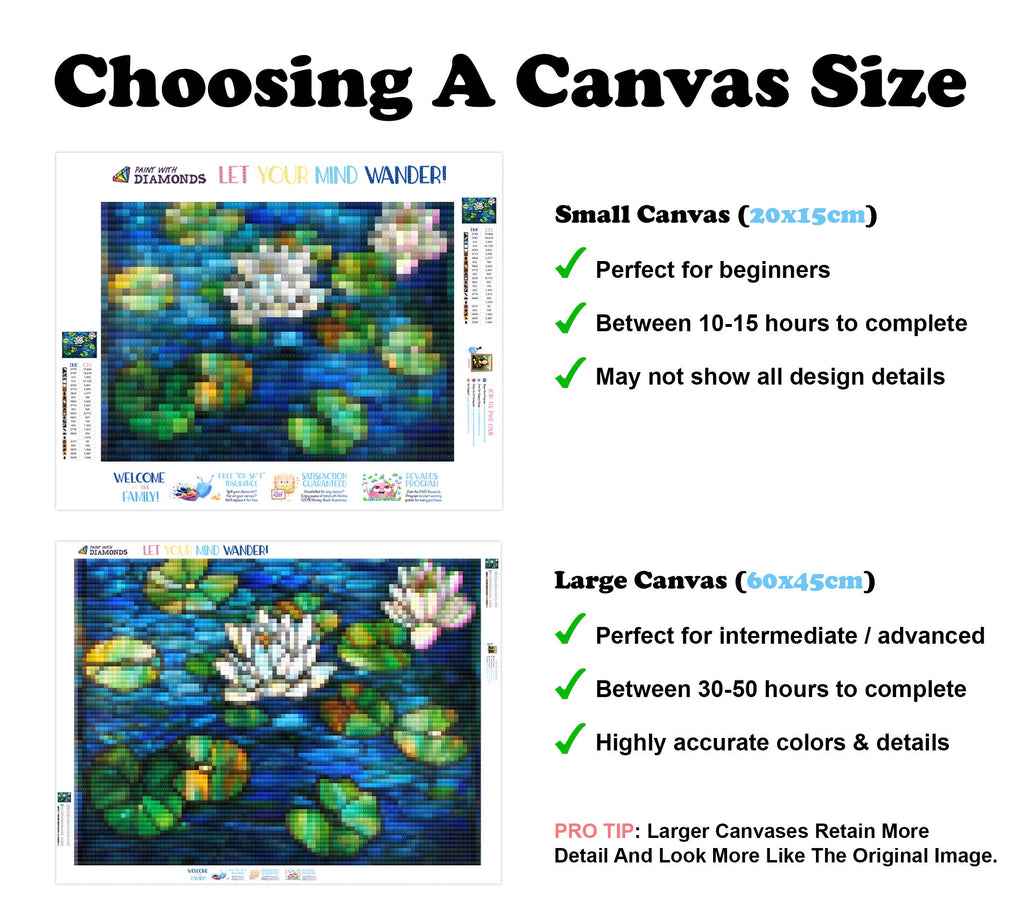 Large canvases show tiny details and all lettering, but may take up to 50+ hours to complete.