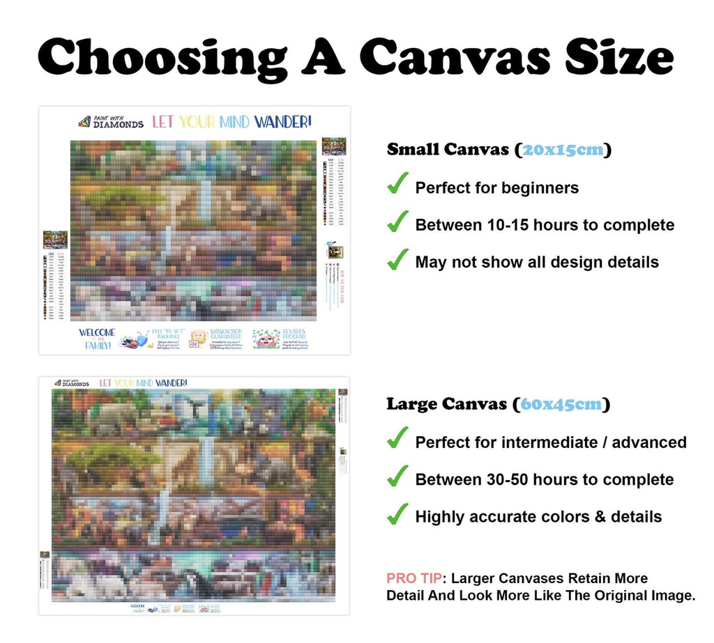 PREMIUM DIAMOND PAINTING KIT: Official Diamond Art kit includes 1x stay-flat adhesive canvas, 1x set of shimmering eco-friendly resin diamonds, and 1x premium toolkit. Diamonds cover the whole canvas.