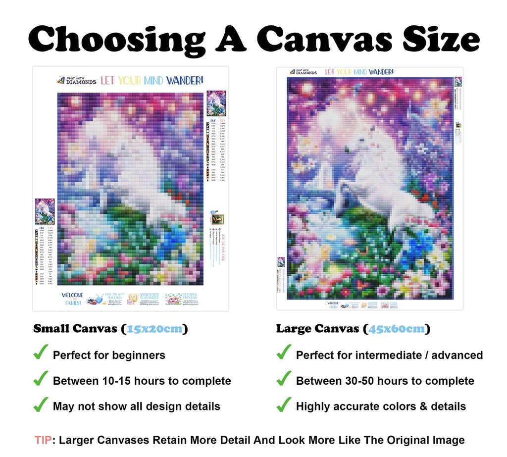 Large canvases show tiny details and all lettering, but may take up to 50+ hours to complete.