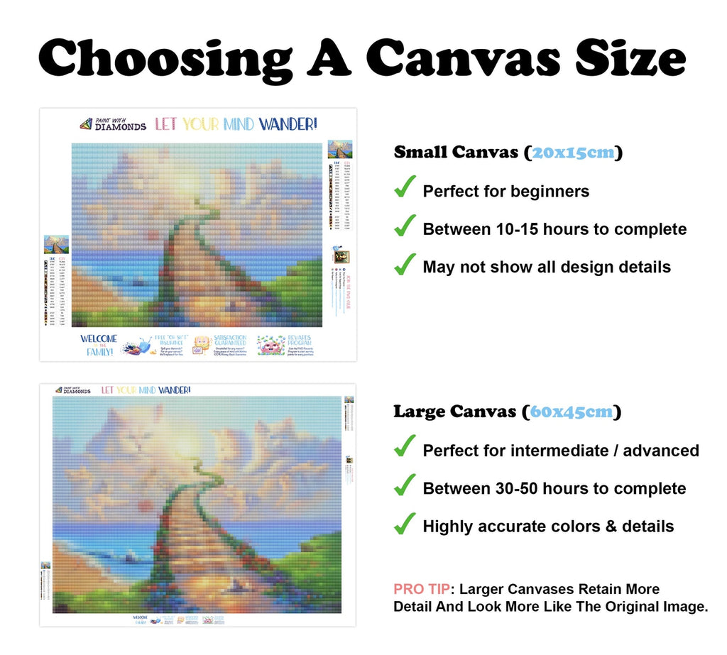 Large canvases show tiny details and all lettering, but may take up to 50+ hours to complete.Medium canvases show significant detail but take between 20-30 hours to complete.